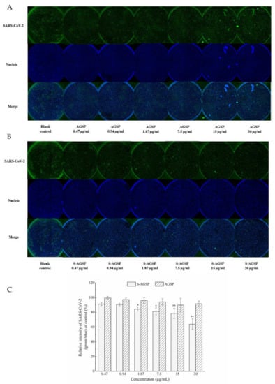 The inhibitory effects of AGSP and S-AGSP against SARS-CoV-2 infection in Vero E6 cells were tested. Representative images of the immunofluorescent assay showed the inhibition effects of AGSP and S-AGSP on SARS-CoV-2 infecting Vero E6 cells at various concentrations (Figure 4). The ratio of green to blue indicated the SARS-CoV-2 infection rate in Vero E6 cells. When the concentration of S-AGSP was increased, the ratio of virus to live cells declined (Figure 4B). This result indicated that S-AGSP inhibited the SARS-CoV-2 infection of Vero E6 cells. AGSP showed no significant difference compared with the blank control group for concentrations ranging from 0.47 to 30 µg/mL. However, S-AGSP showed obvious inhibition of SARS-CoV-2 infection in concentrations as low as 1.87 μg/mL (Figure 4C).