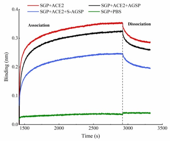 Biolayer interferometry affinity measurements of SGP to ACE2 in the presence of AGSP or S-AGSP. Red line: SGP with ACE2; black line: SGP with ACE2 and AGSP; blue line: SGP with ACE2 and S-AGSP; green line: SGP with PBS. Association–dissociation curves illustrate dissimilar affinities when AGSP or S-AGSP interfered.