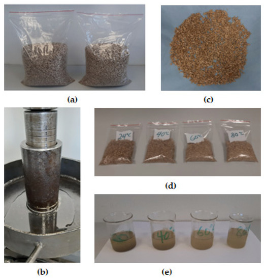 (a) Hulled sunflower seeds in sealed transparent plastic bags; (b) measured sample loaded in a pressing vessel with a plunger placed atop showing the extracted oil in a metal pan; (c) sample after first pressing spread out on a tissue; (d) samples after the fifth repeated pressing for each temperature to obtain the residual oil in the seedcake after the first pressing; (e) extracted oil in a beaker at each temperature of 24 °C (control), 40 °C, 60 °C and 80 °C.