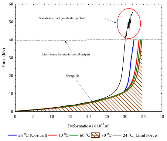 Universal compression testing equipment (TEMPOS spol. s.r.o., Opava, Czech Republic (Machine Service), a ZDM 50, VEB Werkstoffprüfmaschinen Leipzig, Germany) and a pressing vessel of 60 mm diameter with a plunger were used to extract the oil from the hulled sunflower seed samples at a control temperature of 24 °C and heating temperatures of 40, 60 and 80 °C at a preset load of 40 kN (equivalent pressure of 14.147 MPa), speed of 4 mm/min and sample pressing height of 60 mm (sample volume of 16.965 × 10–5 m3 or an initial weight of 103.29 g to a final weight of 65.31 ± 0.70 g) (Figure 1b–e). The preset load (limit force) was determined from a preliminary test, being the curve with the serration effect, which was characterized by the ejection of the seedcake through the bottom holes of the pressing vessel (Figure 2). After the first pressing at 60 mm to obtain the maximum oil from the bulk seed samples, a repeated pressing was done to recover the residual oil in the seedcake until there was no need for further pressings (plastic deformation). The second, third, fourth and fifth repeated pressings were done at pressing heights of 50 mm, 40 mm, 35 mm and 30 mm, respectively. In all, at each temperature, five separate tests were conducted, making a total of 40 tests and repeated twice. From the compression tests and the data obtained, the oil yield, oil expression efficiency and deformation energy were calculated according to the following equations (Equations (1)–(3)) [25,50,51,52]: