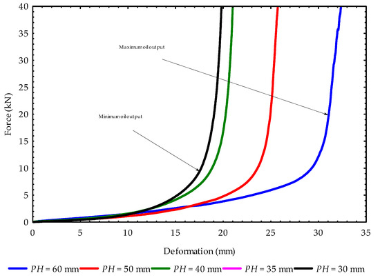 Force–deformation curves of hulled sunflower seed oil extraction at repeated pressings for the control temperature of 24 °C ( = 60 mm is the initial pressing height) represent the temperatures of 40, 60 and 80 °C for maximum oil output. The pink curve is under the black curve.