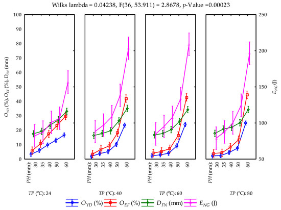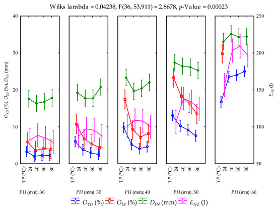 Least square means of the calculated parameters and their factors’ interactions (vertical bars denote 95% confidence interval; PH: pressing height; TP: temperature;
