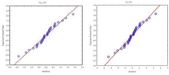 The means and standard deviations of the calculated parameters (oil yield, oil expression efficiency, deformation and deformation energy (hereinafter referred to as energy)) from the compression tests at the various pressing heights and temperatures are provided in Table 1. The samples were repeatedly pressed to obtain the maximum oil output from the bulk oilseeds and the residual oil in the press/seedcake. The total amounts of oil yield ranged from 48.869 ± 6.023% to 41.798 ± 3.557%. Oil expression efficiency ranged from 87.117 ± 10.736% to 74.512 ± 6.341%. Deformation and energy values ranged from 120.510 ± 7.679 mm to 120.210 ± 3.748 mm and from 533.709 ± 65.644 J to 587.932 ± 15.183 J, respectively. At an initial pressing height of 60 mm, oil yield and oil expression efficiency showed an increment with the increase in heating temperatures, whereas deformation values decreased but energy values increased from temperatures of 24 °C until 60 °C and then decreased at 80 °C (Figure 4). Regarding the repeated samples at the pressing heights between 50 mm and 30 mm, oil yield, oil expression efficiency and energy decreased with temperature in contrast to deformation values, which increased at the pressing heights of 40 mm, 35 mm and 30 mm. Generally, all the calculated parameters decreased along with the pressing heights from 60 mm through to 30 mm for all the heating temperatures between 40 °C and 80 °C and the control temperature of 24 °C (Figure 5). The multivariate tests of significance and test of the whole model of the effect of the factors and their interactions on the calculated parameters are provided in Table 2 and Table 3. The significance of the tests was established based on the fact that the p-value was less than the 5% probability level. This implies that the varying factors (pressing height and temperature) significantly influenced the calculated parameters. The coefficient of determination (R2) values ranged from 0.972 to 0.992, respectively. The principal parameters (oil yield and energy) were further subjected to post hoc tests by employing the Duncan test of homogeneity (Table 4 and Table 5). By arranging the means of the principal parameters from the lowest to the highest, twelve groups of homogeneous means represented as four stars (****) were observed for oil yield, where seven of those were observed for energy. The means of the same group indicate no significant difference from each other, whereas the different groups underscore significant differences from each. The normal probability plots of the calculated parameters are illustrated in Figure 6. The normality assumption was satisfied since the data points approximately followed a straight line.