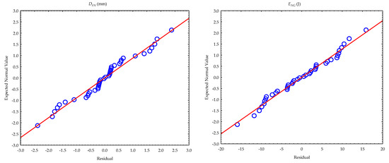 Normal probability plots of the residuals of the calculated parameters (: oil yield; : oil expression efficiency; : deformation; : energy).