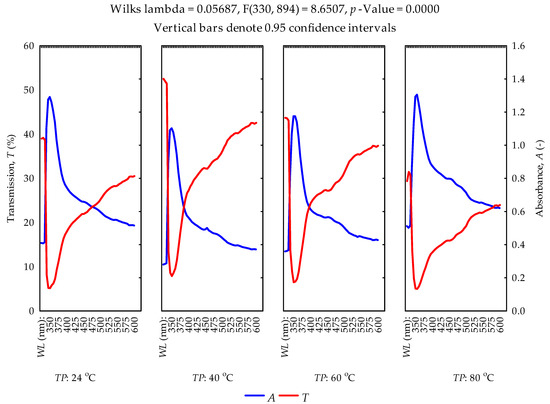 The following supporting information can be downloaded at: https://www.mdpi.com/article/10.3390/foods11182866/s1, Table S1: Descriptive statistics of the effect of the factors on absorbance and transmittance, Figure S1: Scatterplot of absorbance versus wavelength at 95% confidence interval, Figure S2: Scatterplot of transmittance versus wavelength at 95% confidence interval, Figure S3: Scatterplot of absorbance versus temperature at 95% confidence interval and Figure S4: Scatterplot of transmittance versus temperature at 95% confidence interval.