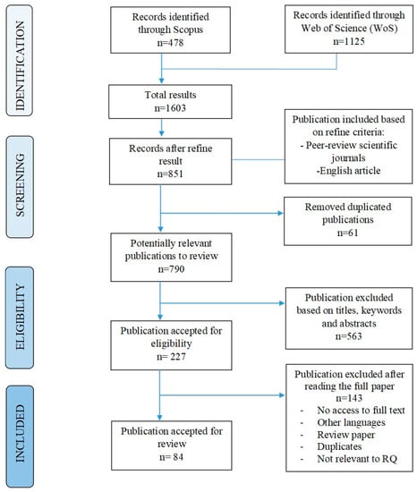 To answer the research questions (RQs), the advanced retrieval functions in the Scopus and Web of Science (FSTA resources) collection databases were used to retrieve the relevant papers according to the criteria. A search string (Table 1) was developed to ensure the quality of the literature. This study was performed in 2019 and was periodically updated until January 2022. The preliminary search yielded 1603 records. For inclusion criteria, the document categories were firstly limited to peer-reviewed scientific journals and English-language articles, excluding forms such as conference papers, proceedings, book chapters, reports, and editorial materials. A total of 851 records was left after this first-round inspection. Next, data from accepted articles were loaded into Endnote (online bibliographic management software), version basic, Clarivate Analytics (https://access.clarivate.com/#/login?app=endnote, accessed on 1 February 2022). Endnote software facilitates duplicate removal. After removing the duplicates (61 articles), the remaining articles was retrieved and evaluated for relevance by carefully reading the title, keywords, and abstract.