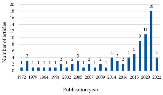 Annual publication trend of 84 papers between 1972 and January 2022 retrieved from Scopus and Web of Science (WoS).
