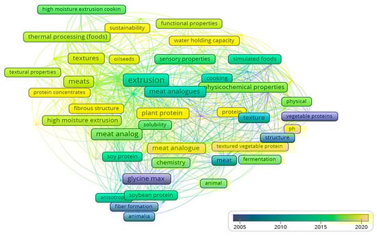 In the network presented in Figure 7, each circle represents a keyword. A node depicts a term in a publication title or abstract. The size of a node indicates the number of publications in which it is present. The nodes are colored based on this journal’s average year of occurrence using the color scheme depicted in the legend. Nodes closer to each other are more similar than nodes further apart. The thickness of a link between two nodes indicates the likelihood that they co-occur in the same publication. The minimum number of occurrences of the keywords is three. From 594 keywords, 71 meet the threshold. It was found that a number of authors utilized variants of keywords. The most frequently occurring terms were “extrusion” (27 documents), “protein” (25 documents), and “meat” (16 documents), followed by the terms “moisture” (15 documents), “meat analog” (14 documents), “plant protein” (13 documents), “meat analogues” (11 documents), and “meat analogue” (10 documents). Early in the twenty-first century, there was an increased interest in “soy proteins”, “glycine max (soy bean)”, and “triticum aestivum (wheat)”, as well as “flour”, “vegetable protein”, “gluten”, and “plant protein” (average publication year: 2005–2010). In recent years, authors have increasingly focused on “extrusion”, “meat analogues”, “high moisture extrusion cooking”, “functional properties”, and “mechanical properties” (average publication year: 2015–2020).
