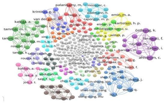 Our search revealed that 297 authors contributed to the total number of publications based on the selected 84 articles. Figure 8 depicts a network visualization of the authors’ co-occurrence network for all the publications analyzed in this search, which formed 56 clusters. Each circle indicates a different author’s name. The size of the circle is proportional to the number of articles each author has written on this subject. In general, the greater the proximity of authors in the visualization, the stronger their bibliographic connection. Only 43 authors had two or more publications, whereas 254 authors had only one publication. Emin, M.A.; Hsieh, F.; and Kabstein, H.P. had the most publications in this dataset with five each, followed by Yao, G. with four publications. In addition, the co-authorship network’s largest connected subgraph included just 18 authors, including Van der Goot, A.J.; Krintiras, G.A.; Cornet, S.H.V.; and Jia, W. The second important subgraph in the co-authorship network consisted of 15 authors, including Grahl, S.; Palanisamy, M.; Saerens, W.; and their peers.
