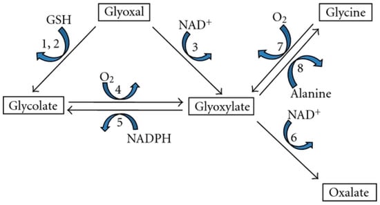 The oxalate in the body has two sources: from dietary sources or from endogenous synthesis [9]. The endogenous synthesis takes place mainly within the liver, from different dietary precursors, such as glyoxalase, ascorbic acid and some amino acids [10]. Oxalate synthesis in the body has essential impact on the rate of oxalate content in the urine and formation of calcium oxalate stone in kidney. Glyoxylate is the major precursor to oxalate production. The main sources of in vivo glyoxylate metabolism are phenylalanine, glycine, hydroxyproline, tryptophan, pentose sugars, glucose, fructose, ethanolamine and glycolate [11,12,13]. Metabolism of oxalate formation from the glyoxal precursor is performed according to the cycle shown in Figure 2 [14].