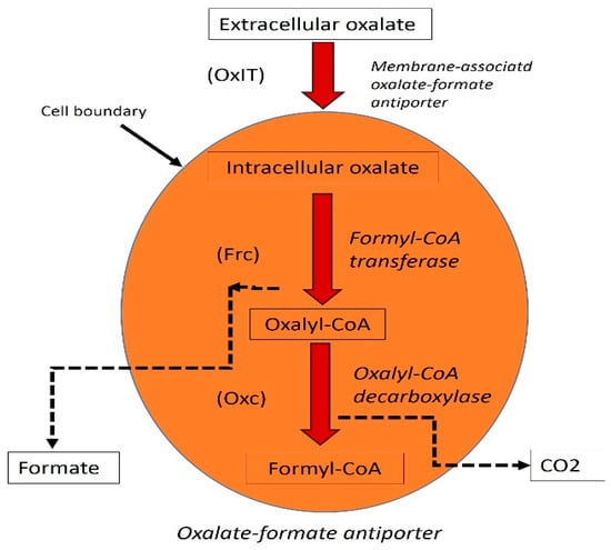 The genes for oxalyl-CoA decarboxylase (oxc) and formyl-CoA transferase (frc) play a key role in oxalate metabolism in O. formigenes and LAB were isolated by Allison [21]. By utilizing oxc and frc as catalysts in a two-step enzymatic reaction, oxalate can be metabolized into CO2 and formate.