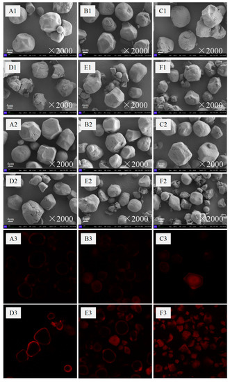 CLSM is commonly used to study changes in the internal structure of starch granules. In this study, a methylene blue (MB+) fluorescent stain was used to specifically label the -COO− of the OS group inside and on the surface of OSA-starch granules, thus observing the distribution of the OS group in OSA-starch. Figure 1A3–F3 shows CLSM images of the jet milling-pretreated and OSA-modified corn starch samples. The native corn starch did not show fluorescence (images are not shown). The fluorescence of OSA-modified starch without jet milling pretreatment appeared mainly at the periphery of the starch granules, indicating that OSA reacted on the surface of starch, and the OS groups were distributed on the surface of the starch granules. This can be attributed to the fact that the OSA agent is not easily soluble in water, and it is difficult for the OSA droplets to penetrate inside the starch granules, thus forming a stronger fluorescence on the surface of starch granules. Laser irradiation of OSA-starch pretreated by airflow crushing at different intensities revealed that the content of OS groups (-COO−) in OSA-starch was positively correlated with the degree of substitution, i.e., higher substitution showed stronger fluorescence intensity [23]. When the classifier rotational speed of jet milling treatment was 3600 rpm, it can be seen that the starch was broken into fine particles, the OSA binding sites to the starch increased, and the fluorescence increased and intensified. This indicates that jet milling pretreatment improved the esterification of the corn starch with OSA by enhancing the degree of OS substitution.