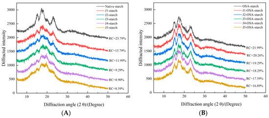 Figure 2 shows XRD spectra for the native and treated corn starch. The native corn starch showed a typical “A-type starch” with strong characteristic diffraction peaks around 15.8°, 17.1°, 18.2°, and 23.5°. It can be seen in Figure 2A. After the jet milling process, with the increase in the classification speed, although no new diffraction peaks were generated, the intensity of the diffraction peaks weakened with the increase in the rotation speed, which indicated that the jet milling did not change the crystalline morphology of ordinary corn starch, and still showed “A-type starch”, but pulverization reduces the crystallization degree of common corn starch. It can be seen in Figure 2B. In contrast, no new diffraction peaks were generated after the esterification with OSA. The degree of crystallinity for the J-OSA-starch samples decreased as the jet milling classifier speed increased, which can be attributed to the fact that the mechanical force of jet milling destroyed the internal crystalline structure of corn starch, the jet milling induced destruction of amylopection and average amylopection chain length, decreasing starch crystallinity, resulting in an increase in the non-crystalline region and a decrease in starch crystallinity, while the OSA-modified groups were mainly grafted in the non-crystalline region of the starch [24]. These results indicate that jet milling pretreatment significantly reduced the crystallinity of corn starch and enhanced the esterification of corn starch with OSA.