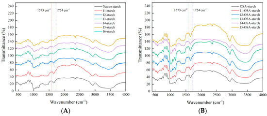 FTIR spectra of J-starch and J-OSA-starch: (A), FTIR patterns of J-starch; (B), FTIR patterns of J-OSA-starch.