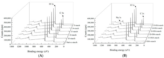 XPS analysis of J-starch and J-OSA-starch: (A), XPS patterns of J-starch; (B), XPS patterns of J-OSA-starch.