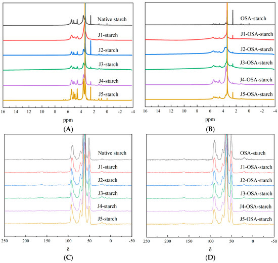 1H-NMR and 13C-NMR spectra of J-starch and J-OSA-starch: (A), 1H-NMR spectra of J-starch; (B), 1H-NMR spectra of J-OSA-starch; (C), 13C-NMR spectra of J-starch; (D), 13C-NMR spectra of J-OSA-starch.