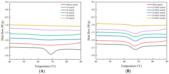 DSC spectra of J-starch and J-OSA-starch: (A), DSC spectra of J-starch; (B), DSC spectra of J-OSA-starch.