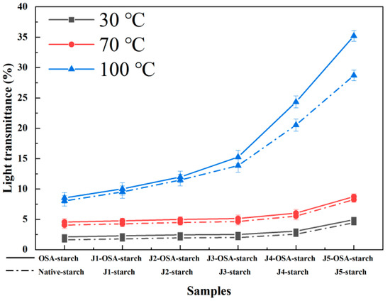 The starch suspension was prepared at a concentration of 1% (w/v), heated in a water bath at 30 °C, 70 °C, and 100 °C in water, and then cooled to room temperature. The light transmission of the starch paste was measured using a UV spectrophotometer at a wavelength of 650 nm, and distilled water was used as a reference [19].