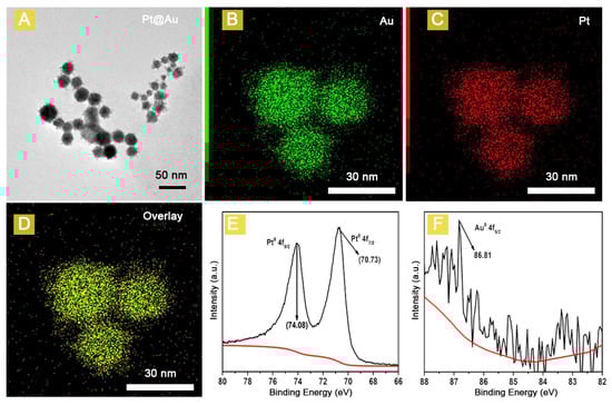 TEM images of Pt@Au (A); elemental mapping images of Au (B), Pt (C), and Au and Pt (D) in Pt@Au nanoparticles; and high-resolution XPS spectra of Pt4f (E) and Au4f (F).