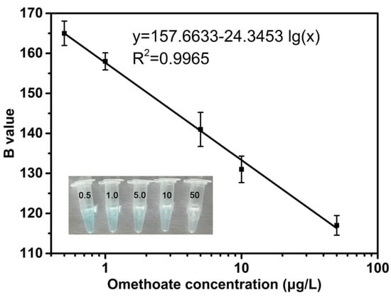 Under the above experimental conditions, the omethoate standard solution with different concentrations (0, 0.05, 0.1, 0.5, 1.0, 5.0, 10, 50, 100, 200, 500 μg/L) was detected by the developed colorimetric sensor. The immunoprecipitated complex (Pt@Au@Antibody-OCA@MPMs) was separated by external magnetic force and 400 μL of TMB mixture solution was added to the above complex system. After color reaction for 5 min, the B value of the detection system was obtained in a dark box using the SpotxelRReader software. The dark box device was prepared by transforming an LED photo studio (Figure S1). There is a circle of lights on the top of the dark box device, and the lights can be lit by a mobile power supply or a socket power supply. As shown in Figure 3, the B value shows a decreasing trend with increasing omethoate concentration (0.5, 1.0, 5.0, 10, 50 μg/L), which is due to the competition between omethoate molecules and the capture probe with respect to binding to the catalytic signal probe. The visual detection results regarding the presence of different omethoate concentrations (0, 0.05, 0.1, 0.5, 1.0, 5.0, 10, 50, 100, 200, 500 μg/L) are shown in Figure S2 in the Supplementary Materials. The linear detection equation for omethoate is y = 157.6633-24.3453 lg(x) (R2 = 0.9965), and the linear detection range is 0.5 to 50 μg/mL, with a detection limit of 0.01 μg/mL. To evaluate the sensitivity of the developed colorimetric sensor under the working conditions (Table S1), the same anti-omethoate antibody and coating antigen were employed to establish traditional indirect competitive ELISA for the detection of omethoate. The standard inhibition curve of the ELISA for omethoate is shown in Figure S3. The limits of detection (IC15) and sensitivity (IC50) of ELISA for omethoate are 5.54 μg/L and 131.17 μg/L, respectively. Compared with the ELISA for omethoate, the sensitivity of the developed colorimetric sensor is improved by two orders of magnitude. Compared with the other methods for detecting omethoate presented in the literature [31,32,33,34], this proposed colorimetric sensor improves the specificity and detection speed for omethoate (Table S2).