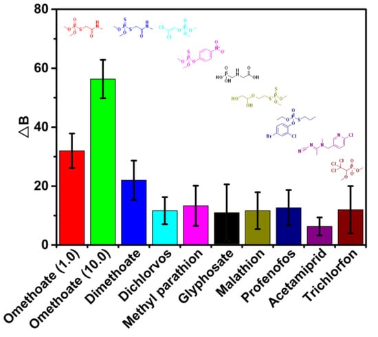 The evaluation of specificity is an important indicator for an immunoassay. In this work, dimethoate, dichlorvos, methyl parathion, glyphosate, malathion, profenofos, acetamiprid, and trichlorfon, as functional and structural analogs of omethoate, were employed to evaluate the specificity of the colorimetric sensor. As shown in Figure 4, the ΔB was 15 and 75 when the concentrations of omethoate were 0.1 μg/L and 10 μg/L, and the difference in the B value (ΔB) between the sample without omethoate and 1000 μg/L of different analogs of omethoate, respectively. The inset is the structure diagram of the corresponding structural analog of omethoate. Meanwhile, the ΔB values for dimethoate, dichlorvos, methyl parathion, glyphosate, malathion, profenofos, acetamiprid, and trichlorfon were less than 10. These results indicate that the anti-omethoate antibody specifically recognized omethoate, and that the constructed colorimetric sensor, with a good specific recognition for omethoate, would not be affected by the functional and structural analogs of omethoate. The constructed colorimetric sensor is able to analyze omethoate with high specificity in real samples.