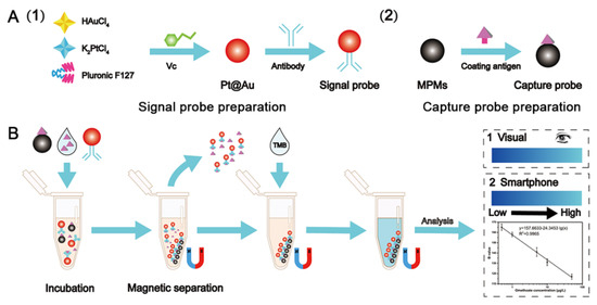 The preparation of the signal probe, capture probe and detection process is shown in Scheme 1. K2PtCl4, HAuCl4, Pluronic F127 and Vc were employed to prepare the Pt@Au nanozymes, and MPMs and coating antigen of omethoate were used to prepare the capture probe (Scheme 1A). The capture probe, the omethoate standard (or sample) solution, and the signal probe are dropped into a 1.5 mL centrifuge tube and incubated for 20 min. As shown in Scheme 1B, the supernatant containing the Pt@Au@antibody-omethoate (or Pt@Au@antibody) was discarded under external magnetic force. Then, TMB solution was added into the tube containing the immunoprecipitated complex (Pt@Au@Antibody-OCA@MPMs). In the absence of omethoate molecules, the color visible to the naked eye was the bluest, and the B value based on the smartphone reading was the highest. With the increase of omethoate concentration in the detection system, the less signal probes captured by the capture probe, the visible color by the naked eye was lighter, and the B value obtained by the smartphone was relatively lower. According to the obtained B value and the concentrations of omethoate, the quantitative detection standard curve for omethoate was constructed.