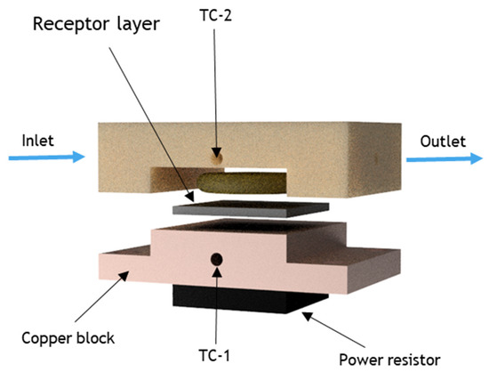 Melamine (C3H6N6) is a heterocyclic organic compound that is widely used in combination with formaldehyde and other agents to produce synthetic resins. Melamine resins are hard and highly durable materials, which find their application in the manufacture of many products, such as kitchenware and laminates [1]. Furthermore, because of its high nitrogen content (66% by mass), low price, and the fact that protein levels in milk are indirectly assessed via the total nitrogen content, it has been added intentionally into milk in order to mimic protein-rich milk products [2,3]. The oral ingestion of high concentrations of melamine can cause serious health issues, including bladder cancer [4], renal failure [5], or even fatality in humans and animals [6,7]. For this reason, the maximum residual levels allowed in milk and milk products are set at 2.5 mg/kg by The Codex Alimentarius Committee (CAC) [8]. Sensors that allow for routine screening of dairy products in a low-cost manner could enable end-users and industrial stakeholders at various points in the dairy production value chain so as to identify melamine adulteration rapidly and significantly decrease its adverse effects on the general healthcare system [9]. In the last few years, several well-established techniques have been developed for the quantification of melamine levels in milk products. However, most of these essays are based on expensive lab-based technologies such as high-performance liquid chromatography (HPLC) [10], liquid chromatography–tandem mass spectrometry (LC–MS/MS) [11,12], and surface-enhanced Raman scattering spectroscopy (SERS) [13,14]. Although current laboratory tests are very sensitive and can accurately determine the melamine levels in the samples, the analysis is typically slow and costly. Moreover, such complex matrices often require pre-treatment of the food sample to accurately perform these analyses [15,16]. As a result, standard practice is to only take samples at regulatory intervals and to screen them for melamine adulteration, leaving several cases unnoticed. Low-cost alternatives that allow for routine screening of products are thus highly desirable. Although low-cost melamine sensors are already present in the market, they usually do not offer quantifiable information in terms of the legal limit and they require reagents or labels. Moreover, these commercial sensors are based on enzymes, colloidal gold, or antibodies, with the main disadvantage for these being their limited stability, thus leading to relatively short shelf-life and the need for storing the sensor at determined temperatures and conditions. Biosensors could offer a low-cost alternative and in recent years, biosensors based on so-called molecularly imprinted polymers (MIPs) have specifically gained attention [17,18,19,20]. MIPs are synthetic receptors capable of selectively binding to a target through a “lock and key” mechanism and, as such, are considered synthetic substitutes of natural antibodies [21]. MIPs have been extensively studied in the last decades, and their high application potential in food safety and clinical diagnostics [22,23,24,25] is primarily due to the advantages over their natural counterparts in terms of chemical and environmental stability, straightforward preparation, and cost-effectiveness [26,27]. These features make MIPs ideal candidates for the recognition of different molecules and biomarkers in complex matrices [28,29,30]. To develop viable sensors, MIPs need to be combined with a readout technology that is capable of converting binding events at the receptor surface into a quantifiable signal, while operating in complex media. The heat-transfer method (HTM) [31] can detect temperature changes across a solid–liquid interface, allowing for various targets, ranging from small molecules to bacteria, and, more recently, viral antigens for COVID-19 diagnosis [32,33,34,35,36]. In short, when the target solution is introduced into the flow cell, MIP particles bind to the analyte, resulting in a thermal change at the interface. This change is then detected as a change in temperature in the medium above a sensor chip, registered by a thermocouple placed inside the flow cell (TC-2), while another thermocouple (TC-1), coupled to a PID-based temperature control system, stringently steers the input temperature underneath the sample (Figure 1). By actively steering the temperature input and monitoring the temperature output, the sensor is able to monitor the difference in thermal resistance across the solid–liquid interface.