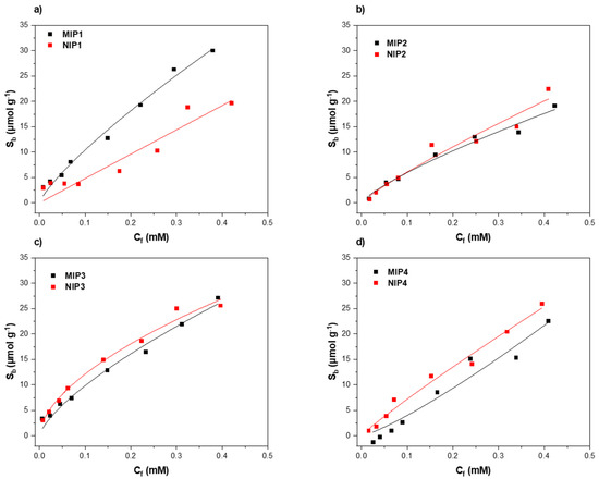 For each composition, a dose–response curve was constructed by calculating the free concentration of melamine found in the solution (Cf) (mM) after the rebinding experiment, and to obtain the corresponding substrate bound (Sb) (μmol g−1) values, which indicate the amount of target bound (in micromoles) per grams of MIP at each data point. Finally, the obtained Cf and Sb values were plotted and dose–response curves for all of the synthesized MIP/NIP compositions were obtained. The data were fitted (allometrically; y = axb) with Origin 2021b (OriginLabs Corporation, Northampton, MA, USA). In Figure 2, each of the synthesized MIP compositions (black squares) are plotted together with the corresponding NIP (red squares).