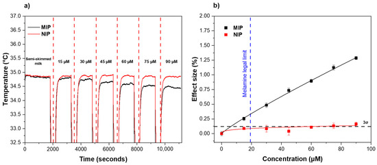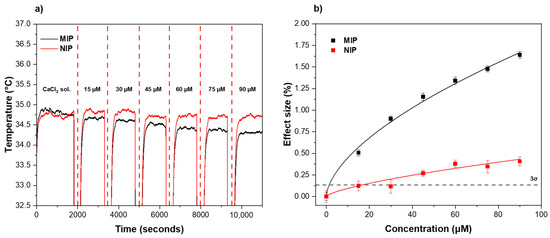 After preparation of the receptor layer via micro-contact deposition, the thermal response of the functionalized aluminum surfaces to melamine was examined using the HTM method. The receptor layer was therefore exposed to different concentrations of melamine (0–90 μM) in 1.6 mM CaCl2 solutions over a defined time period (Figure 3). To enable direct comparison between MIPs and NIPs, the analysis was run in parallel. A distinct decrease in temperature within the flow cell was observed when a higher concentration of melamine was introduced across the MIP-based receptor layer (black line). This trend was traced back to the interactions between the MIP particles and the analyte. More specifically, MIP contained recognition sites that were complementary to the melamine molecule in the shape, size, and distribution of the functional groups, thus allowing the analyte to perfectly fit in the nano-cavities present in the polymeric network. When the binding event occurred, the MIP cavities at the surface of the receptor layer were gradually filled, changing the thermodynamic properties of the interfacial layer, which translated into an increase in the interfacial thermal resistance, registered as a diminished heat flow through the sample into the solution inside the flow cell (Figure 3a, black line). In comparison, the same effect could be observed when analyzing the thermal response of the NIP (Figure 3a, red line), but the decrease in temperature in the flow cell in response to higher concentrations of melamine was much lower. This trend was mainly attributed to non-specific interactions between melamine and functional groups on the NIP surface. The temperature profiles over time were used to construct dose–response curves for both MIP and NIP by plotting the different concentrations of melamine injected against the effect size as a function of the temperature change. The effect size was calculated using the same equation reported in previous work [39] (Equation (1)).