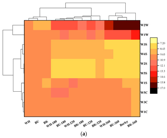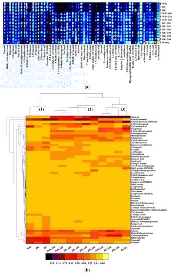 The volatile aromas of the RCHB attributed to the responses of E-nose sensors are shown in Figure S1, which reveals that the aromas sensitive to W1C, W3C, W5C, W1W, W2W, and W1S were apparently changed. Further hierarchical clustering analysis (HCA) indicated that the volatile aromas were generally divided into three clusters (Figure 1a), including cluster 1 (W1C, W3C, W5C, and W1S), cluster 2 (W2S, W3S, W5S, and W6S), and cluster 3 (W1W and W2W), respectively. Similarly, CHB and its roasted counterparts were also classified into three groups, in which the raw CHB was assigned to one group and was well discriminated from the RCHB and roasted barley. Besides, WH-180, WH-220, BU-180, BU-220, BK-180, and BK-220 were gathered and appeared to be distinctly separated from the group composed of WH-260, BU-260, and BK-260. Preliminary PCA results revealed that the first two principal components accounted for over 96.40% of the total variance (80.10% for PC1 and 16.30% for PC2) in the volatile aromas (Figure 1b). W1W and W2W were observed to be positively related to WH-260, BU-260, BK-260, and the roasted barley, suggesting relatively higher responses to aromatic compounds and sulfur organic compounds due to their low sensory detection thresholds whilst remaining flavor active (Table S1), consistent with the previous findings in the case of the roasted barley [36]. WH-180, WH-220, BU-180, BK-180, and BK-220 were found to be associated with W1S, W1C, and W3C, apparently distinct from BU-220, which showed high relevance to W5C. Similarly, the raw CHB was discriminated from the RCHB and presented a close association with W2S, W3S, W5S, and W6S. These findings showed that roasting CHB significantly changed its volatile aromas, which varied depending on roasting temperature and were not cultivar-dependent.
