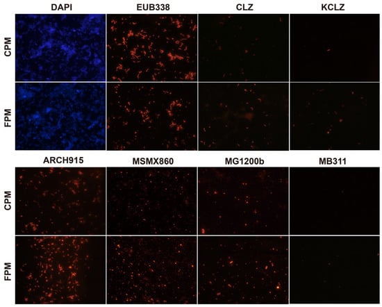 Differences in core microbes of fortified artificial pit mud (FPM) and conventional artificial pit mud (CPM) based on fluorescence in situ hybridization. DAPI, total microbes; EUB338, eubacteria; CLZ, Clostridium; KCLZ, Clostridium kluyveri; ARCH915, archaea; MSMX860, Methanosarcinales; MG1200b, Methanomicrobiales; MB311, Methanobacteriales.