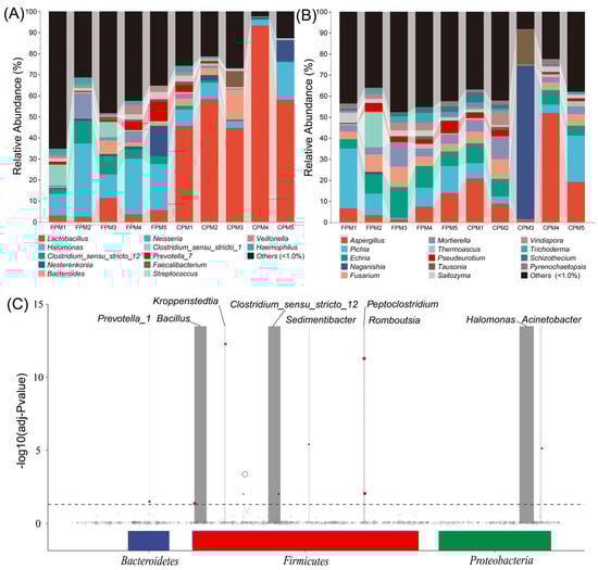 The bacterial communities of the two kinds of APMs were composed of 37 phyla, in which Firmicutes and Proteobacteria accounted for 69.49% to 98.47% of the total relative abundance (RA) (Figure S2A). The RA of Firmicutes in the CPM was remarkably higher than that in the FPM, while that of the Proteobacteria was the opposite. A total of 823 taxa were identified at the genus level, and 12 genera with an average RA >1.0% were defined as dominant (Figure 2A). Among them, a significantly higher abundance of Lactobacillus was observed in the CPM, while Halomonas and Clostridium_sensu_stricto_12 were remarkably enriched in the FPM (t-test, p < 0.05). The co-existence of Clostridium_sensu_stricto_12 and Lactobacillus has been observed in PM with different pit age [20,36], while Halomonas was not detected, and its contribution to SFB fermentation needs further study. For the fungi, 168 genera belonged to nine phyla, and Ascomycota was dominant in almost all the samples except CPM3, which was featured by Basidiomycota (Figure S2B). Correspondingly, CPM3 was governed by Naganishia at the genus level, while the other samples were represented by Aspergillus, Pichia, and Echria (Figure 2B). Aspergillus and Pichia were prevalent in the PM [15,17], whereas Naganishia and Echria have never been reported as the dominant genera, suggesting that PM may be a seed bank containing a large number of unknown microorganisms [34]. Additionally, there was also no significant difference in these dominant fungi in the two kinds of APMs (t-test, p > 0.05). In fact, the limited oxygen environment of PM was not suitable for the propagation of most fungi, resulting in a lower proportion and biomass [34,35]. However, the enormous fungal richness in Daqu may migrate into the PM during fermentation and accumulate gradually in the prolonged production process periodically [15]. Therefore, the fungal communities in PM might be mainly correlated with the pit age [20].