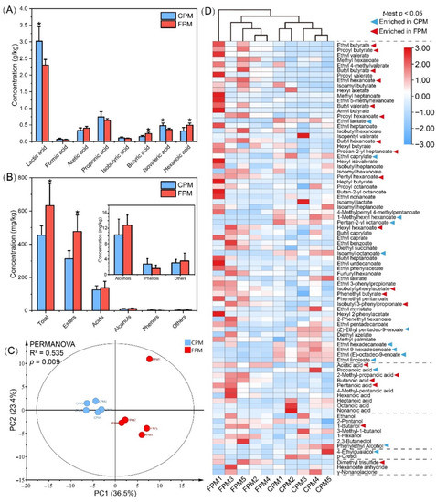 The concentration of major organic acids (A) and volatile compounds (B) in FPM and CPM, and the principal component analysis (C) and cluster heatmap analysis (D) of volatile compounds. * represents significant difference (t-test, p < 0.05).