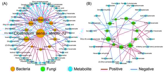 The correlation analysis between dominant microorganisms and metabolites in artificial pit mud. All links represent the significant correlation based on Spearman’s correlation coefficient (|ρ| > 0.7 and p < 0.05). The size of each microorganism node is proportional to its degree of connection with the volatiles; (A) bacteria; (B) fungi.