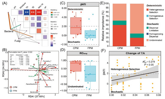 To explore the effect of FD on the bacterial community assembly of APM, βNTI and RCbray were calculated to quantify the determinism and stochasticity [30]. The results of βNTI showed that both the determinism (|βNTI| > 2) and the stochasticity processes (−2 < βNTI < 2) governed the community assembly of the CPM, whereas the latter controlled that of the FPM (Figure 5C). Furthermore, the distribution of RCbray values suggested that undominated (|RCbray| < 0.95) was the primary stochasticity process in the two kinds of APMs (Figure 5D), accounting for 40% and 60% of the CPM and FPM, respectively (Figure 5E). Both the stochastic and the deterministic processes will affect the community assembly of the ecosystem, but the former was more important as the availability of resources increased [43], which was in line with the NH4+-N content of the two APMs (Figure S3). Similarly, the stochastic process was more dominant for the bacterial community assembly in soil aggregates with a higher soil organic carbon and total nitrogen level [44]. In addition, the increase in the stochastic process in the FPM may imply that adapted lineages of bacteria accumulate, resulting in weaker niche-based exclusion and higher biodiversity [43,45], which explains the significantly higher α-diversity in the FPM (Figure S1). Conversely, the contribution of heterogeneous selection for the community assembly in the CPM was higher than in the FPM (Figure 5E). According to the previous study, heterogeneous selection usually occurs when the changing of environmental pressures across space or time leads to a narrower niche breadth [46]. For example, only species that can resist high acid stress and oligotrophic conditions can survive in the surface water of an acid mine drainage lake due to the strong heterogeneous selection [47]. Notably, our results also indicated that the relative importance of heterogeneous selection increased with the TA content (Figure 5F). Therefore, the high proportion of heterogeneous selection in CPM might be closely related to its extreme environmental conditions, especially the high TA content, which inhibited the growth and metabolism of most acid-intolerant microorganisms, such as Clostridium and methanogen [48].
