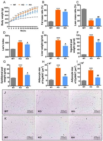 HTE attenuated phenotypes of obesity in Lepr−/− rats. HTE, Huangshan Maofeng green tea extracts; WT, wild type littermates; KO, leptin receptor knockout rats; KH, leptin receptor knockout rats with HTE administration. (A) Body weight; (B) fat mass ratio; (C) lean mass ratio; (D) Lee’s index; (E) liver weight; (F) inguinal fat weight; (G) epididymal fat weight; (H) adipocyte size of inguinal fat; (I) adipocyte size of epididymal fat; (J,K) Hematoxylin–eosin staining of the inguinal fat and epididymal fat (100 × magnification). * p < 0.05, *** p < 0.001, compared to WT group; # p < 0.05, ## p < 0.01 versus KO group (n = 4–6, means ± SEM).