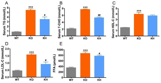 The serum lipid panel of each group of rats. (A) Total cholesterol; (B) triglyceride; (C) high-density lipoprotein cholesterol; (D) low-density lipoprotein cholesterol; (E) free fatty acids. *** p < 0.001 versus WT group; # p < 0.05, ## p < 0.01 versus KO group (n = 5, means ± SEM).