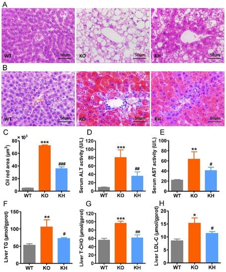 HTE ameliorated hepatic steatosis in Lepr−/− rats. (A,B) Histological examination of liver structure with H & E staining and ORO staining; (C) oil red area of the liver tissue section; (D,E) the activity of serum ALT and AST, respectively; (F) triglyceride levels in liver; (G) total cholesterol levels in liver; (H) low-density lipoprotein cholesterol levels in liver. * p < 0.05, ** p < 0.01, *** p < 0.001, compared to WT group; # p < 0.05, ## p < 0.01, ### p < 0.001 versus KO group (n = 4–6, means ± SEM).