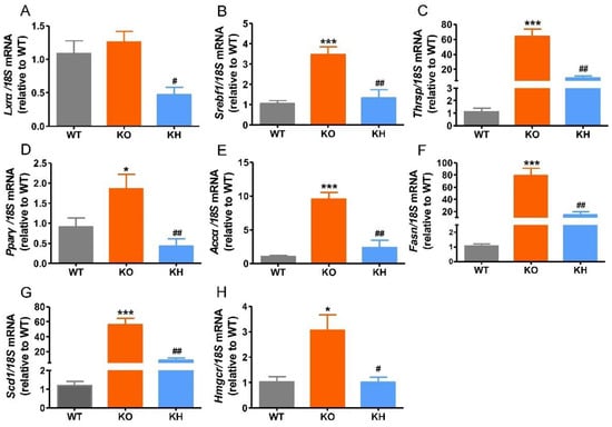 Previous studies have shown that dysregulation of hepatic lipogenesis genes is associated with obesity []. Therefore, the expression levels of lipogenesis related genes were evaluated to investigate the regulating effect of HTE on lipid metabolism in Lepr−/− rats (Figure 4). Our results showed that the expression levels of Srebf1, Thrsp, Pparγ, Accα, Fasn, Scd1, and Hmgcr remarkably increased in the KO group compared to the WT group. However, HTE supplementation significantly reduced the expression levels of Lxrα, Srebf1, Thrsp, Pparγ, Accα, Fasn, Scd1, and Hmgcr (p < 0.05), which is consistent with lower levels of serum FFA, TG, and TC in the KH group.