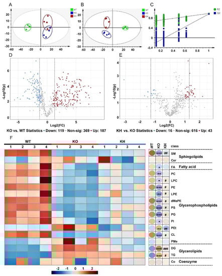 HTE altered lipid classes in liver of Lepr−/− rats. (A) PCA score plots for the hepatic lipids (R2X = 0.907; Q2 = 0.518); (B) PLS–DA score for the hepatic lipids (R2X = 0.864; R2Y = 0.994; Q2 = 0.905); (C) PLS–DA model validation (R2 = 0.645; Q2 = −0.35); (D) Volcano plot displaying differential lipid classes between KO and WT; (E) Differential lipid classes between KH and KO. In the volcano plot, a number of significantly different lipid species were filtered out based on the criteria of FC ≥ 2 or ≤ 0.5 and p ≤ 0.05. Red (up) and blue (down) dots represent significant differentials of lipid species, whereas gray dots represent no significant differences of lipid species (n = 4). (F) Heat map representing lipid class levels. Values that were higher and lower than the mean will be shown in red and blue boxes, respectively. * p < 0.05, ** p < 0.01, *** p < 0.001, compared to WT group; # p < 0.05, ## p < 0.01, ### p < 0.001 versus KO group (n = 4, means ± SEM).