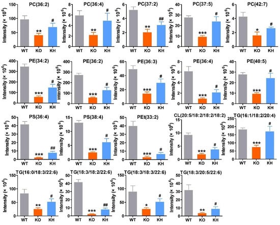 Nineteen lipid species were significant reversibly increased by HTE in liver of Lepr−/− rats. Values are the mean ± SEM (n = 4). * p < 0.05, ** p < 0.01, *** p < 0.001, compared to WT group; # p < 0.05, ## p < 0.01 versus KO group.