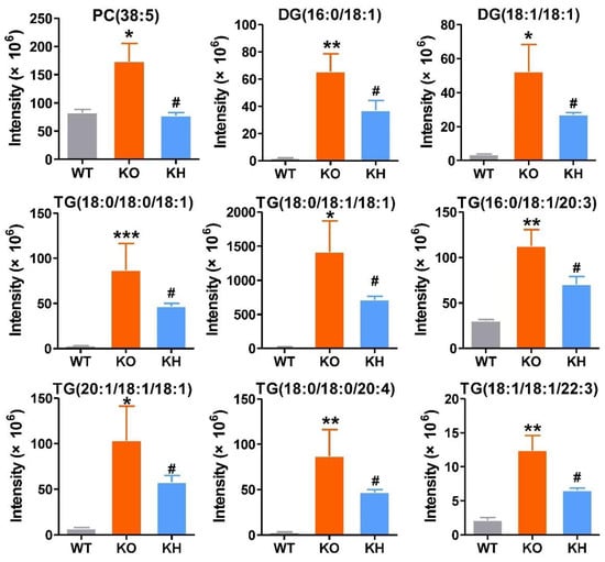 Nine lipid species were remarkable reversibly decreased by HTE in liver of Lepr rats. Values are the mean ± SEM (n = 4). * p < 0.05, ** p < 0.01, *** p < 0.001, compared to WT group; # p < 0.05 versus KO group.