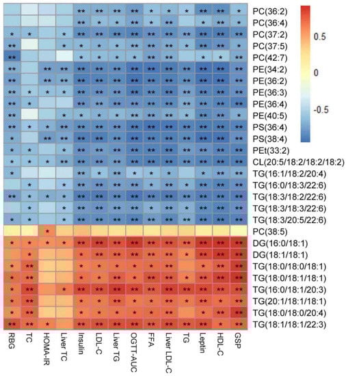 Spearman’s correlation between lipid species and obesity related indexes. Significant correlations are indicated by * p < 0.05, ** p < 0.01. RBG, random blood glucose; HOMA−IR, homeostatic model assessment of insulin resistance; OGTT-AUC, area under curve of oral glucose tolerance test; GSP, glycated serum protein level. The RBG, HOMA−IR, OGTT−AUC, GSP, insulin, and leptin levels are showed in Figure S5 in the Supplementary Materials.