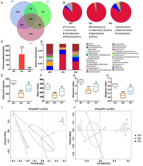 It has been shown that diet mediating biological function is closely related to gut microbiota modulation []. Therefore, we examined the effects of HTE on gut microbiota homeostasis using 16S rRNA sequencing. A total of 844 bacterial OTUs were obtained, and 608 OTUs were found in the WT group, whereas 244 OTUs were identified in the Lepr−/− group. After administration with HTE, the number of OTUs in the KH group increased to 443 (Figure 9A). At phylum level, the abundance of Firmicutes was significantly increased in the KO group, while the abundance of Proteobacteria, Bacteroidetes, Deferribacteres, Actinobacteria, Fusobacteria, and Melainabacteria were remarkably reduced in the KO group as compared to the WT group (Figure 9B). After administration with HTE, the microbiota composition at the phylum level in the KH group was revised to the WT group (Figure 9B). As shown in Figure 9C, by comparing the Lepr−/− group to the WT group, we found that the relative abundance of Bacteroidetes was decreased significantly, while Firmicutes were increased, which resulted in a higher F/B ratio in the KO group. After HTE intervention, the F/B ratio in the KO group was dramatically reduced. We further analyzed the microbiota composition at the genus level and found that the richness of gut microbiota in the KO group was reduced when compared to the WT group and KH group (Figure 9D). To investigate the effect of HTE on α–diversity of gut microbiota in Lepr−/− rats, including the observed species index, the Chao 1 index, and the Shannon and Simpson indexes, we found that the KH group showed significant increases in these indexes when compared with the KO group (Figure 9E–H). According to the principal coordinates analysis (PCoA) based on the unweighted and weighted UniFrac, three groups of rats had significantly different gut microbiota compositions and structures (Figure 9I,J).