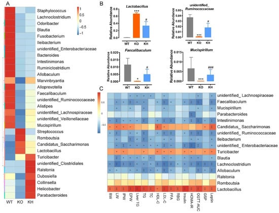 HTE altered the gut microbiota composition in Lepr−/− rats. (A) The heatmap of the top 30 genera among the various groups; (B) relative abundance of the gut microbiota at the genus level (p < 0.05); (C) heatmap of spearman’s correlation between microbiota and obesity related parameters, significant correlations are marked as * p < 0.05, ** p < 0.01. BW, body weight of rats; LW, liver weight; IPW, inguinal fat weight; EPW, epididymal fat weight. * p < 0.05, *** p < 0.001 versus WT group; # p < 0.05, ### p < 0.001 versus KO group (n = 4–5, means ± SEM).