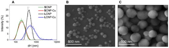 Size distribution of CNPs. (A) Hydrodynamic diameter distribution, as evaluated by DLS of pristine and Cu-loaded CNPs suspended in water. Each line is the mean of five measurements of the same suspension. Error bars represent the SD. (B,C) FE-SEM images of (B) SCNP and (C) LCNP.
