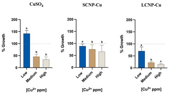 The antimicrobial activity of CuSO4, SCNP-Cu e LCNP-Cu (low, medium, high copper concentration) was evaluated against Listeria monocytogenes. The optimal growth condition of Listeria monocytogenes as a negative control (109 CFU/mL) during the MIC experiments is indicated as 100% on the y-axis (dashed gray line). The x-axis represents the copper concentration (low, medium and high) for each antimicrobial. Average values are used for the histogram representation, and values with different superscript letters (a, b, c) are significantly different (p < 0.05).