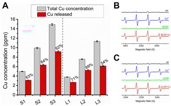 Figure 3B,C, report the EPR signals recorded on SCNP-Cu and LCNP-Cu suspensions containing the spin trapping agent DMPO in the presence of hydrogen peroxide. The signal of soluble copper was also measured as a control. Intense EPR signals were recorded for SCNP-Cu, LCNP-Cu, and CuSO4, while CNPs in their pristine form showed a signal similar to that of the negative control. These results are in agreement with our previous observations [11].