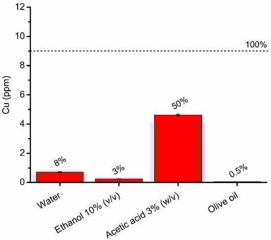 All samples were thawed at room temperature on the day of the analyses. The amount of copper ions released in each simulant was determined by ICP-OES. Samples containing water and acetic acid as simulants were directly analyzed, while ethanol samples were diluted at a ratio of 1:10 with ultrapure water. In contrast, olive oil samples were prepared following the extraction induced by emulsion breaking (EIEB) method [53,54,55,56]. First, the extracting solution was prepared by dissolving 2.0 g Triton X-100 in 100 mL nitric acid 3% (v/v). Then, olive oil samples were vigorously shaken, and 7.0 g of each sample was transferred into a 50 mL Falcon tube containing 7 mL extracting solution. A sample of pure olive oil was also prepared with the same procedure and used as a control. The mixtures were vigorously shaken for 30 seconds and placed in a thermostatic bath at 90 °C for 60 min. After emulsion breaking, two phases were observed: an upper phase containing the edible oil and a lower aqueous phase (acid medium) containing the extracted metals. Finally, all samples were centrifuged at 1500× g, 25 °C for 10 min (by ROTINA 380R, Hettich, Westphalia, Germany) to better separate the different phases and stored overnight at 4 °C. The following day, the aqueous phase was recovered using a Pasteur pipette and directly analyzed.