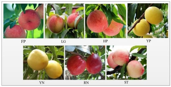 A total of 7 cultivars of peaches were harvested from shihezi, Xinjiang, China, including the flat peach (FP), liguang peach (LG), honey peach (HP), yellow peach (YP), yellow nectarine (YN), red nectarine (RN) and shoutao (ST) (Figure 1). A total of 420 peach fruits and 60 for each sample were taken from different positions of 5–6 (upper, middle and lower) trees (5–15 years old). Ripe peaches that had not been damaged or infected by fungi were harvested based on color, firmness, aroma and the grower’s judgment. After the harvest, peaches were randomly divided into three replicates. Peaches were immediately washed with distilled water within 2 h, and the peach surface was wiped dry with gauze, then enucleated and packaged in an airtight polyethylene bag and stored at −4 °C until analysis.